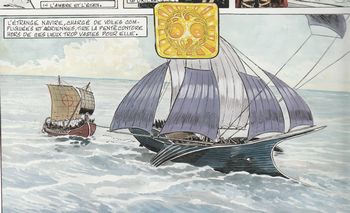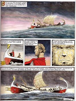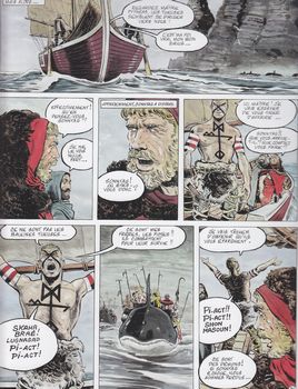 remarques: | récit du voyage antique et mythique de Pythéas, navigateur et explorateur, sur sa pentécontore (= bateau de guerre à 50 rameurs) au delà des colonnes d'Hercule (Gibraltar) pour découvrir le pays de l'ambre (elektron) et de l'étain (cassitérite), voyage qui le menera via la Bretagne, les Cornouailles, l'Ecosse et finalement à Thulé (Islande) >> p. 14 rencontre avec Octopodia, la pieuvre géante >> p. 24 rencontre aussi avec le rhinocéros laineux >> p. 31 le picte Sonntag au corps peinturluré finalement, perdu dans les glaces du nord et dans le soleil qui ne se couche jamais, un navire hyperboréen piloté par des atlantes reconduira Pythéas sur le bon chemin tout en lui remettant de nombreuses richesses dont l'orichalque n.b. (l’orichalque, en grec oreíkhalkos, littéralement cuivre des montagnes, était un métal légendaire à base de cuivre et d'or, utilisé couramment par les habitants de la mystérieuse Atlantide >> graphisme et scénario toujours en vogue pour ce voyage effectivement accompli par Pythéas annexes - couverture de l'album - page de garde - extraits de page - le pentécontore remorqué par le navire atlante n.b. >>> biographie Guy Mouminoux alias Dimitri voir CBD no 63 (Adèle Blanc-Sec) ainsi que dossier Dimitri 462D2+E Information - Pythéas le Massaliote est un astronome grec, considéré comme l'un des plus anciens explorateurs scientifiques ayant laissé une trace dans l'histoire - Pythéas a effectué un voyage dans les mers du nord de l'Europe vers 325 BC, mais son récit, connu dans l'Antiquité, n'a pas survécu, il ne sera que partiellement révélé par les écrits de quelques auteurs parmi lesquels principalement Strabon et Pline l’Ancien - Pythéas fait partie des plus anciens auteurs de l'Antiquité connus à avoir décrit, notamment, les phénomènes polaires, les marées ainsi que le mode de vie des populations du nord de l’Europe - Pythéas a évoqué l’île de Thulé et sa description des marées est le texte le plus ancien qui suggère la lune comme leur cause |