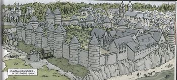 remarques: | France 1569 sous Charles IX avec Henri de Guise, héraut des catholiques, 1569, Henri d'Anjou avec le maréchal Tavannes vient de battre les troupes de Coligny à Jarnac, Margot retrouve son ami d'enfance Henri de Guise qu'elle appelait Guisin, elle en tombe amoureuse Coligny est de nouveau battu à Moncontour, mais il reste une menace pour le royaume, Catherine de Medicis veut négocier, elle offre à Coligny une place au conseil du roi et lui propose de marier Margot à Henri de Navarre pour réconcilier catholiques et protestants >> un premier album pas trop mal conçu, texte et graphisme acceptables mais moins bon que les deux séries antérieures: tentations de Navarre et la mort et le diable annexes - couverture 1er et 2ème plat - portrait de Catherine de Medici - château d'Angers Information A) la lignée des Valois depuis François Ier: 1/ Henri II (1547-1559) 2/ François II (1559-1560) 3/ Charles IX (1560-1574), le roi de la Ste-Barthélemy 4/ Henri III (1574-1589), dernier des Valois, assassiné par Jacques Clément 5/ Henri IV (1589-1610), premier roi Bourbon B) Louis de Béranger seigneur du Guast, mignon d'Henri III, est né vers 1540 - en 1564, il fut l'amant de Françoise Babou de la Bourdaisière épouse d'Antoine d'Estrées ami de Pierre Ronsard, du Guast est décrit comme étant brave, brutal, cruel et terriblement batailleur, très aimé du roi Charles IX, gentilhomme de la chambre du roi Charles IX en 1570, du Guast avait un régiment à son nom en 1571, il passa pour s'être chargé de beaucoup de sang innocent à la Saint-Barthélemy - toutefois, il encourait la haine de Marguerite de Valois qui le nommait le potiron de ce temps, un parvenu, un méchant homme, car il avait dénoncé Entraguet comme son amant et du Guast appelait Marguerite la reine des putains C) Charles de Balsac d’Entragues, surnommé le Bel Entraguet 1545-1599, mignon de Henri III, participe au duel des mignons |