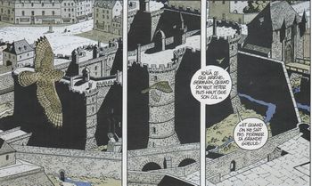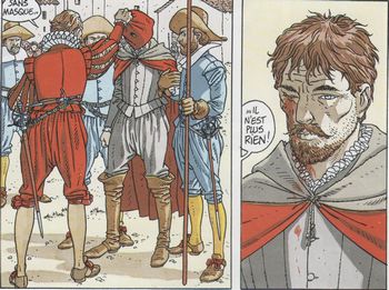 remarques: | 1610 mort d'Henri IV, l'après-règne s'installe avec la Régence de Marie de Medicis et de Concini, le masque rouge est en piteux état, Grandpin est jeté en prison tout comme Leonard Langue-Agile >> p. 13 l'épitaphe d'Henri IV dans les entrailles d'un chien après s'être réconcilié avec son frère Yvon, Gabriel part pour Paris pour rencontrer Grandpin, il apprend que celui-ci a été mis en prison et Gabriel, lors d'une cérémonie, rencontre le roi et lui demande la libération de Grandpin, mais la reine-mère n'est pas de cet avis, elle fait emprisonner Gabriel qui s'échappe mais tombe dans une fosse à lion où il perdra encore un oeil dans le combat, puis il est à nouveau emprisonné dénouement mortel pour le prévôt Torchepot qui abuse un peu trop de la patience de Léonard Langue-Agile, tandis que Ariane et Guillemot préparent la succession de masque rouge en élevant un petit épervier >> toujours un excellent graphisme et un scenario respectable annexes - couverture originale - scènes du tome 5 dont le masque rouge dévoilé - couverture réédition 1992 |