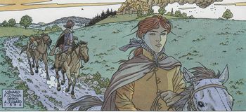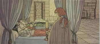 remarques: | Paris, Louis XIII libéré de l'emprise de la reine-mère gouverne avec De Luynes et se débarrasse de Concini, dans les théâtres on joue "masque rouge", pour fêter son accession Louis XIII fait libérer tous les détenus dont Grandpin et Gabriel de Troïl, Grandpin règle d'abord ses comptes avec Pignerol >> p. 16 mention des trois mousquetaires chez les Troïl, Ariane a fait de Guillemot le nouveau masque rouge, Grandpin veut retrouver son ancien maître Gabriel et se rend au château des Troïl, en route, il sauve Ariane d'une situation désagréable, mais profite lui-même de la situation, ignorant l'identité d'Ariane, ce que celle-ci ne lui pardonnera longtemps pas Marie, la ménagère des Troil apprend à Ariane sa vraie origine (fille de Gabriel), en voulant délivrer Colin, fils de Marie, condamné à mort comme étant le masque rouge, Guillemot se fait tuer en duel par Taillefer après que celui-ci ait réglé ses comptes avec Bruantfou père, Taillefer tue Guillemot en croyant que celui-ci est le masque rouge au château, Grandpin découvre Yvon de Troïl qui s'est pendu par désespoir et Gabriel a disparu sans laisser de traces >> p. 40 Grandpin qui se brûle la barbe par inadvertance >> p. 46 dernière planche: Grandpin qui s'est rasé la barbe part avec Ariane vers une destination inconnue après avoir tous deux mis le feu au château de Troïl en laissant se consumer 4 cadavres: Yvon, Guillemot, Marie et Colin n.b. comment Marie est-elle morte? de chagrin? >> le sang pisse dru dans ce 6ème volume où l'on opère à un grand nettoyage, le graphisme est toujours très bon et le scenario reste intéressant annexes - couverture originale - scènes du tome 6 - couverture réédition 1922 |