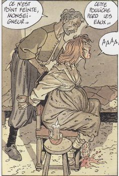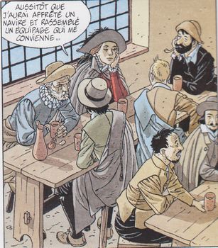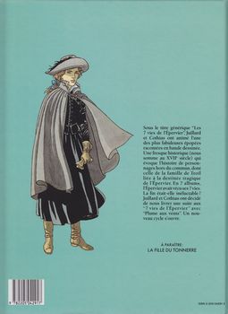 remarques: | début du 2ème cycle des 7 vies de l'Epervier sous le titre "plume aux vents" (au Nouveau Monde) premier tome: la folle et l'assassin de son duel avec Condor alias Gabriel son père, Ariane s'est remise physiquement grâce aux soins des religieuses de l'hospice de St-Vincent-de-Paul, mais Ariane n'a plus toute sa raison, et c'est là que Monsieur, Gaston d'Orléans, frère du roi, recherche des femmes pour son bon plaisir, Ariane est reconnue et amenée dans le château de Monsieur après y avoir été malmenée, Ariane accouche d'une petite fille qui lui est enlevée et abandonnée dans une forêt où elle sera recueillie par un couple de bourgeois, elle deviendra célèbre sous le nom de Ninon Lenclos >> page 9 né-an-moins (nez-en-moins) >> page 11 même les chevaux s'excitent >> page 13 l'accouchement d'Ariane quant à Ariane, elle réussira à échapper à ses bourreaux et se réfugie dans son ancien hôtel de Paris où elle rencontre Taillefer (une ancienne connaissance) qui la prend sous sa protection >> p. 34 Taillefer va remplumer Ariane (le nouvel épervier?) tous deux décident de se rendre en Amérique l'une pour y retrouver son père, l'autre pour finir sa mission de provoquer et de tuer le vrai masque rouge en duel >> page 45 hommage à Hergé, Tintin et Haddock dessinés dans la dernière vignette n.b. lors du voyage vers les Amériques, Ariane et Taillefer seront accompagnés par Champlain, gouverneur de la Neuve-France (Québec) et par Hippolyte Beurré d'Amamis, représentant de la compagnie de la traite des peaux qui propose à Ariane de l'épouser et qui sera silencieusement éliminé par Taillefer >>> départ d'une nouvelle série du cycle avec la résurrection d'Ariane, série qui reprend quelque peu la suite de Coeur brûlé, scénario et graphisme restent toujours de bonne fracture n.b. le prochain album annoncé: la fille du tonnerre mais ce sera en fait l'oiseau-tonnerre annexes - 1er et 4ème plat de l'album - une Ariane en piètre état - Tintin et Haddock |