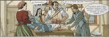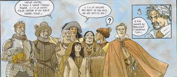 remarques: | dernier volet du deuxième cycle de l'Epervier Grandpin et Oiseau-Tonnerre sont condamnés à la pendaison, discussions sur la civilisation par les trois singes noirs jésuites, tandis que Taillefer fait valoir ses droits pour un duel entre lui et Oiseau-Tonnerre = Gabriel de Troïl >> p. 20 le tableau de famille le nez de Champlain en voit de toutes les couleurs tandis que Oiseau-Tonnerre se débarrasse rapidement de Taillefer lors de leur duel >> p. 25-27 le duel entre Oiseau-Tonnerre et Taillefer l'execution continue mais le dieu Feu-Tonnerre mettra tout le monde d'accord >> p. 31 la délivrance de Grandpin et Oiseau-Tonnerre fin du cycle, les anglais occupent Québec, Ariane et Grandpin se retrouvent flibustiers avec Beau-Ténébreux sur l'île de la Tortue, et lors de la capture d'un navire espagnol, nos deux pirates s'emparent d'un beau jeune savant hidalgo qui fera les délices de Beau après avoir bourlingué un temps sur les mers faisant fortune en capturant de riches navires espagnols (mais sans la participation de Oiseau-Tonnerre), Ariane, Gabriel, Germain et Beau décident de se rendre en Europe pour rendre hommage à Blanche et Yvon de Troïl >> p. 33 dernière apparition de Léonard Langue-Agile dans la série (il reviendra quelque temps dans coeur brûlé) >> p. 34 l'hommage de Germain à Ariane juste avant l'abordage d'un navire espagnol >> p. 41 la capture du savant hidalgo Pablo de Lena et de ses amis: 24 caisses de livres >>> la boucle est bouclée, Germain et Ariane pourront faire de nombreux petits éperviers, dernier album de la série, un graphisme sans surprise, un scénario au dialogue plutôt banal (surtout à la fin de l'album) les héros sont fatigués et Juillard ne voulait de toute façon plus continuer la série (il la continuera nez-en-moins en 2014 12 ans plus tard mais pauvrement et en un seul album avec un autre essai en 2021) n.b. les albums des autres cycles: 7 vies de l'épervier (1983), coeur brûlé (1991), masque de fer (1991), fou du roy (1995), masque rouge (1984) et Ninon secrète (1992), celle-ci étant la dernière série des 7 cycles y compris Plume-aux-vents (1995) après l'album "15 ans après" collectionné ici, il y aura encore deux autres albums; - qu'est-ce que ce monde? (2021) scénario Cothias, dessinateur Juillard - le fils d'Ariane (2022) scénario Cothias, dessinateur Jovanovic non collectionnés ici il semblerait toutefois en 2025 qu'aucune autre suite n'ait été publiée annexes - couverture de l'album - le tableau d'une famille décédée - couverture modifiée pour la réédition (les 3 premiers albums de la série Plume-aux-vents ne seront pas réédités) - l'amputation |