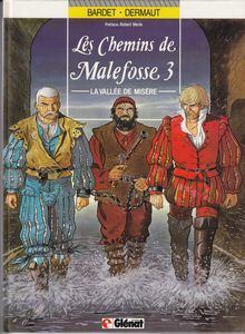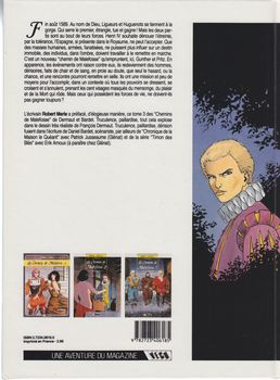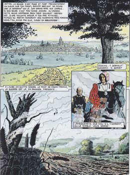 remarques: | Günther et Pritz en route pour Paris retrouvent petit Louis sain et sauf, rencontre aussi avec l'adolescent Façe-de-Suie dans un relais où les deux compères se font détrousser, arrêtés en arrivant à Paris, ils seront cette fois délivrés par Pernette agissant pour le compte de l'archange, maître de la vallée de misère à Paris (= maître des gueux d'un genre de cour des miracles) Paris est alors la place forte des ligueurs et les deux compères se retrouvent maintenant espions pour Henri IV >> p. 46/47 la débauche dans la vallée de la misère et où l'on découvre que l'archange est une femme >>> le graphisme est toujours bon, mais le scenario sans grande originalité et malgré le langage de l'époque, on y perd son latin, toutefois une jolie couverture d'album |