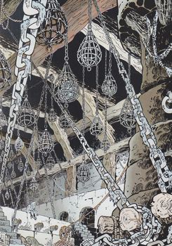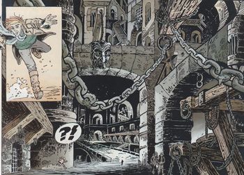 remarques: | un royaume perdu hors du temps, voyage entre présent et moyen âge, luxuriance des décors, précision du dessin et superbes couleurs, les quatre premiers albums sont une véritable réussite Line, une jeune femme s'inquiète pour le journaliste Arthis qui a découvert un endroit mystérieux hors-temps dans les marais du bout du monde, à l'auberge des marais, Arthis rencontre la belle photographe aux cheveux noirs tous deux dans les marais sont enlevés par des mystérieux hommes d'arme et Arthis se retrouve prisonnier dans les caves d'un vieux château où règnent deux bandes rivales: a) celle du moine et du valet b) celle du miteux, du narquois et du chimpanzé Arthis cherche désespérément un moyen de sortir de sa prison tout en pensant à la fille aux cheveux noirs >> p. 25 les cages-pendules >>> un genre nouveau, le scénario est encore hésitant, mais intéressant et le graphisme est déjà superbe |