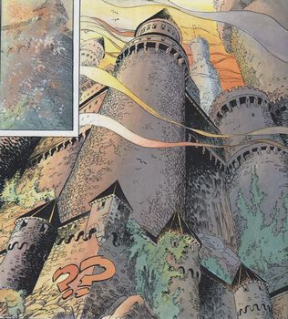 remarques: | Arthis réussit à s'évader par un trou d'eau conduisant à la prison des femmes où il retrouve la femme aux cheveux noirs, mais en continuant son évasion, il tombe aux mains du seigneur Argon qui lui raconte l'histoire du royaume perdu de Galthédoc Argon est le fils bâtard du roi Jehan XI et tente de destituer celui-ci pour pouvoir connaître le monde extérieur = le grand pays, Argon aidera Arthis à regagner le grand pays et lui demande de revenir avec des images du grand pays, il garde en otage la fille aux cheveux noirs. théorie des 4 éléments: eau, terre, air et feu, mais c'est ce dernier qui corromp les hommes (le feu du désir, le feu du pouvroir et de la haine) d'après les principes du philosophe grec Emphédocle d'Agrigente >>> le scénario devient tout à fait intéressant et le graphisme est toujours bien exécuté avec un coloriage de haute qualité |