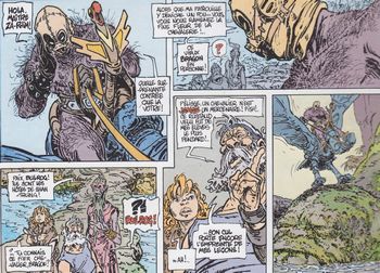 remarques: | premier cycle (4 albums): la quête 1) préface de Rodolphe qui lance Loisel en 1975 avec ses publications dans "Tousse-Bourin" et "Pilote" 2) épisode en 6 planches N&B sur Pélisse 3) la conque de Ramor le message de Mara porté par Pélisse avec sa mascotte Fourreux à Bragon dans le monde d'Akbar >> p. 21 le combat de Pélisse avec son fouet ardent confectionné dans la langue d'un Borak la mission de Pélisse et Bragon consiste à trouver la conque dans laquelle est enfermée le sorcier Ramor qui cherche à se libérer, mais le temps est compté et il ne reste que 10 jours première étape: la marche dans les terres éclatées où le duo rencontre le farfadet Fol de Dol avec ses énigmes pas toujours facile à trouver, finalement Bragon réussira à s'emparer de la conque chez le prêtre-sorcier Shan-Thung Bragon retrouvera aussi Bulrog, un ancien élève, qui suivra le groupe avec un autre allié mystérieux et cagoulé qui est tombé amoureux de Pélisse, la première épreuve est terminée >> un récit de légende, genre heroïc-fantasy qui ressemble quelque peu au monde de Tolkien, mais au genre nouveau avec un récit original, un graphisme qui en est encore à ses débuts, mais déjà bien caractéristique de Loisel et de bonne expression pour les personnages, les décors et la couleur annexes - couverture de l'album - le petit fourreux, étrange animal de compagnie de Pélisse, l'héroïne de la série - cinq vignettes de l'album Information la série aura trois cycles: 1) la quête 2) avant la quête et 3) après la quête les personnages principaux: - Bragon: chevalier légendaire à la retraite, vivant dans une ferme des Hauts-Plateaux du Médir, en Akbar, il combat avec la Faucheuse, hache légendaire forgée par son ancien maître, le Rige - Pélisse: fille de Mara et de père inconnu (on soupçonne Bragon ou encore Bodias), elle part à la recherche de Bragon pour qu'il l'accompagne afin de récupérer l'oiseau du temps, elle est toujours accompagnée par un fourreux et possède le fouet ardent de sa mère, tissé de la langue brûlante d'un borak que Bragon lui avait offerte - le Fourreux: étrange petit animal de compagnie suivant Pélisse où qu'elle aille, il semble lui conférer d'étranges pouvoirs, et sa présence suit de très près la destinée de Pélisse - Javin: personnage énigmatique que rencontre Bragon dans l'avant-quête, il devient son ami et le suivra dans ces aventures, il sera tué par le borak, donnant une raison de plus à Bragon de traquer la bête - Bulrog: guerrier Llir (mercenaire) et ancien élève de Bragon, celui-ci ayant tué ses derniers employeurs, Bulrog poursuivra son vieux maître dans un but de vengeance, finalement, Bulrog aidera les aventuriers dans leur quête, mais doit sacrifier son état de guerrier et sa vie pour sauver Bragon et ses amis - l'inconnu: personnage casqué qui accompagne Bragon et Pélisse, c'est en fait Touret, le valet de ferme du chevalier, qui les suit par ennui du travail de la ferme et parce qu'il ne résiste pas aux charmes de Pelisse, il finit comme mari de Kiskill et comme roi de son peuple, il est également le conteur de cette histoire - Fol de Dol: esprit du fleuve Dol doté de grands pouvoirs, il parle par rimes et pose des énigmes en vers, il ne prend pas parti, s'il reçoit une bonne réponse, il aide par ses conseils, sinon il déchaîne la puissance du fleuve - le Rige: humanoïde à la peau grise, guerrier légendaire, il vit et chasse toute sorte de gibiers dans son domaine, y compris des humains, c'est aussi l'ancien maître de Bragon, nombre de guerriers l'ont défié, mais aucun n'en est revenu en vie, il a forgé et possède une hache similaire à la faucheuse de Bragon qu'il a également forgée - Bodias: prince-sorcier de la marche des Milles Verts, Bodias rejoint la troupe au cours de l'aventure, ancien rival sentimental de Bragon, il finit tué accidentellement par l'inconnu avec le fouet de Pelisse - Kiskill: elle était la servante des dieux jusqu'au jours où elle rencontre l'inconnu (Touret) qui devient son fiancé - Mara: princesse-sorcière de la marche des Voiles d'Écume, pays du peuple palfangeux, ancienne compagne de Bragon, elle est chargée d'enfermer Ramor à jamais, la fin du premier cycle la révélera sous un jour inattendu - Shan-Thung: prince-sorcier de la marche des Terres Éclatées, il fait partie de la race des Gris Grelets, sortes de grands humanoïdes maigrelets, de couleurs grise, Shan-Thung possède le pouvoir de commander à la foudre, vénérée par les Gris Grelets, et permet au prince de garder tout pouvoir sur son peuple, la conque du dieu maudit Ramor est entreposée dans son royaume - Fjel: prince-sorcier de la marche des Lèvres de Sable, le pays des Jaisirs, Fjel est autant le maître spirituel que le prince de sa marche, un désert immense, ces vastes plaines de sable sont contrôlées par un prédateur naturel hors du commun: la Mort Rampante, sorte de ver énorme qui se déplace dans le sable (référence au roman Dune), on trouve dans cette marche le temple de l'oubli, un ancien temple Jaisir, la légende raconte que les dieux l'avaient fait construire aux temps anciens pour s'y reposer, les runes de ce temple furent déchiffrées lors de la quête de l'oiseau du temps - Tharmine: prince-sorcier de la Marche Blanche, il est le dirigeant du fier et pacifique peuple Jivrain, lors de la quête, les Jivrain sont contaminés par une maladie contagieuse rendant cannibales ceux qu'elle affectait, le peuple Jivrain est donc déchiré et leur prince tué |
