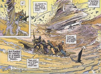 remarques: | le trio suivi par Bulrog est toujours à la recherche de l'oiseau du temps situé sur le doigt du ciel, mais pour y parvenir, il faut traverser les territoires du Rige, un grand chasseur armé d'une grande faucheuse (hache) et accompagné de 3 bestioles repoussantes: Göl, Gallu et Ardate le Rige déclare vouloir traquer Bragon (son ancien élève), mais Bulrog qui vient de sauver Pélisse d'une des bestioles du Rige, se joint au groupe, et Bragon veut aussi tendre un piège au Rige >> page 31 le piège de Bragon avec les oeufs de ponge, toutefois le Rige échappe au piège et à son tour attire Bragon dans son traquenard, mais ce faisant il est attaqué par un ocre géant et indirectement sauvé par Bragon, ce qui n'empêche pas le Rige après coup de provoquer Bragon en duel en prenant Pélisse comme otage >>> page 60/61 le duel entre Bragon et le Rige finalement c'est Bragon qui l'emportera de justesse, l'élève a dépassé le maître la quête continue, il ne reste plus que 3 jours >> à nouveau un très bon épisode de l'oiseau du temps, peut'être même le meilleur de tous, texte très bien conçu et un graphisme magnifique tant pour le récit que pour les décors |