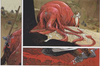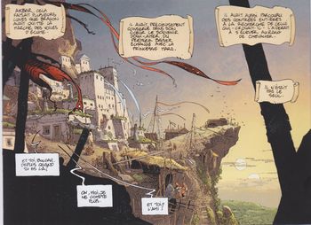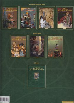 remarques: | dernier album collectionné de la quête de l'oiseau du temps, il y aura encore cinq albums "avant la quête": 4/ le chevalier Bragon (2013) dessinateur: Mallié 5/l'emprise (2017) dessinateur: Etien 6/ Krill (2020) dessinateur: Etien 7/ folle graine (2022) dessinateur: Etien 8/ l'Omégon (2024) dessinateur: Mallié ainsi que plusieurs hors série et intégrales il semblerait qu'un 3ème cycle "après la quête" devrait voir le jour mais aucun n'a paru jsuqu'à maintenant Bragon attend l'occasion de se mesurer avec le Rige, mais il a un concurrent: Devel, champion de l'ordre du signe, Devel précède Bragon et ne veut pas se laisser dépasser, tous deux en viennent aux mains et c'est alors qu'apparait le Rige, Devel le défie et le Rige le bat en duel pour éprouver le courage de Bragon, le Rige l'invite à une partie de chasse, Bragon doit combattre les glabres qui recherchent un appât pour leur proie: le pode rouge (une pieuvre rouge gigantesque) dont les glabres sont friands, Bragon se fait capturer par les glabres et sert d'appât, il est en train de se faire dévorer quand le Rige apparait et d'un coup de sa faucheuse tranche la tête du pode, ayant éprouvé le courage de Bragon, le Rige accepte maintenant de devenir son maître >> le graphisme reste bon sans atteindre la perfection de Loisel et de Lidwine, quant au texte il manque d'envergure par rapport aux premiers volumes annexes - couverture et 4ème plat du tome 3 - deux vignettes de l'album - couvertures des tomes 4 et 5 |