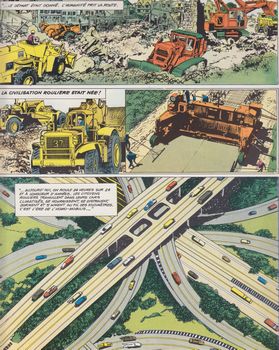 remarques: | les Mange-Bitume ou la chronique de la civilisation des rouliers = l'homo mobilis la saturation du trafic routier dans les années 70 conduit à une réorganisation du circuit routier (notamment par la construction d'autoroutes gigantesques à travers l'Europe) et par la même occasion une réorganisation de la société, la voiture devient la résidence principale et permanente, la civilisation roulière était née >> p. 10 la déclaration de Pompidou: rouler, c'est progresser! >> p. 13 les auto-shops (avec tir aux provisions) 1) l'histoire de Jules Carter mort de faim dans son véhicule à cause d'une erreur d'ordinateur 2) la fugue de deux jeunes gens hors du circuit roulier mais qui doivent renoncer à leur escapade, étant complètement épuisés au bout de 2 km seulement 3) l'accident de travail sur le "circuit patates" en agriculcar 4) infraction au code roulier par un véhicule roulant à vide = le car fantôme qui hante les autoroutes, organisé par show-bizz, la chasse au car-fantôme se déclanche, l'émission de Stan Coach qui prétend que les machines ont pris le contrôle de la civilisation grâce à l'ordinateur Opta qui gouverne les machines et donc la production et la maintenance, un peu plus tard, Stan Coach disparaîtra sans laisser de traces épilogue: les véhicules autonomes vides commencent à se multiplier, les robocars prennent de plus en plus la priorité sur les véhicules des humains et les machines se mettent à rejeter les humains qui deviendront les naufragés de la route >> un album terrifiant et réaliste à la fois, l'emprise de la machine sur l'homme, un problème actuel puisque dans certains secteurs, la machine tenant déjà nos destinées sous contrôle, il n'est toutefois pas encore fait mention dans l'album de la crise de l'énergie qui se déclancha en 1974 et qui chamboulera la société de l'automobile >> un scenario très original et bien présenté de Lob ainsi qu'un bon graphisme de Bielsa |