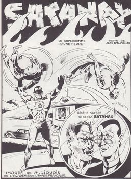 remarques: | les aventures de Satanax en deux tomes Arsène Satard, petit greffier de tribunal, reçoit un jour du sorcier Athanase le pouvoir de devenir un surhomme pour une heure chaque fois qu'il touche du feu >> p. 28/29 Satanax alias Satard en profite pour donner une leçon à sa belle-mère s'en suit 2 épisodes: Satanax contre les hommes-lions et Satanax contre les contrebandiers d'or >> aventures humoristiques et loufoques de Satanax avec sa femme Sylvia un scenario peu original d'Avignac, mais le graphisme de Liquois met l'album quelque peu en valeur (le graphisme étant encore meilleur que celui de Salvator) Information les aventures de Satanax, parent de Salvator, débutent en 1948 dans les éditions Mondiales, c'est bien sûr un remake de Superman n.b. les pages de l'album sont souvent inversées dans la première moitié de l'album biographie de Liquois: >> voir guerre à la terre |