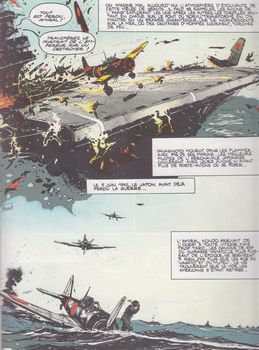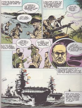remarques: | édition Hachette, collection bande mauve série bien réussie par Dupuis sur la 2ème guerre mondiale, un bon scenario et un super graphisme (éclatant et dynamique) avec une superbe couverture d'album volume 8 la guerre du Pacifique, de Pearl Harbor à Hiroshima, le raid sur Pearl Harbor: 9 cuirassés coulés, mais les deux porte-avions Lexington et Enterprise en manoeuvre échappent au massacre le déferlement japonais: invasion de l'Indochine, de la Malaisie, des Philippines, de la Birmanie et de la Thailande, conquête de l'Indonésie (Indes néerlandaises) avec Sumatra, Java et Borneo, prises de Hong Kong et Singapour, prise de la plupart des îles du Pacifique (Guam, Wake, Gilbert, Mariannes et Carolines) le 9.4.1942 toute l'Asie du Sud-Est était aux mains des japonais, seul Corregidor aux Philippines résistera encore jusqu'au 10.5.1942 et l'Australie était maintenant directement menacée toutefois les japonais connurent leur première défaite à Midway: trois porte-avions japonais coulés en cinq minutes, le quatrième quelques heures plus tard contre un porte-avion coulé pour les alliés la reconquête commença avec la bataille de Guadalcanal, apparition des avions-suicides (kamikaze) les reconquêtes se faisaient en sauts de puce d'archipel en archipel, d'abord Tarawa et les îles Mariannes, puis en juin 44, ce fut le grand tir aux pigeons des îles Mariannes, enfin à la bataille navale de Leyte, les escadres japonaises furent pratiquement anéanties les dernières reconquêtes furent Saipan, Iwo Jima et Okinawa durant lesquelles les américains y subirent de nombreuses pertes, mais les japonais furent décimés et les bombardements dévastateurs des B29 atteignaient maintenant le Japon sans répit >> p. 41 la marche du sacrifice à Okinawa avec le Yamato, le plus grand cuirassé au monde et finalement le projet Manhattan avec les bombes atomiques d'Hiroshima et de Nagasaki précipita la reddition du Japon >> un superbe album tant pour le graphisme que pour le texte et scénario annexes - couverture de l'album - extraits d'album - couverture réédition |
