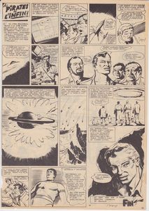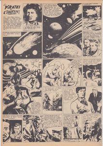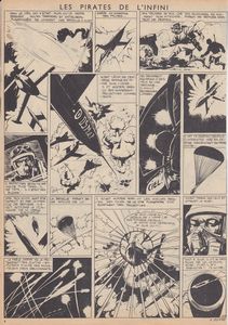 remarques: | 2ème partie des "pirates de l'infini" non parue en album mais dans les fascicules de Zorro l'Invincible du no 45 (septembre 1953) au no 85 (juin 1954) = 59 planches les forces du DSM lancent une offensive pour détruire la base bronsorienne du Sinkiang et délivrer les prisonniers terriens, l'assaut est un échec mais un commando réussit à s'infiltrer dans la base et à délivrer quelques prisonniers >> planche 50B les mitrailleuses au polynitrotolluène entretemps les bronsoriens déclanchent une contre-attaque avec des boules de feu, les terriens décident alors d'atomiser la base de Sinkiang, mais l'arme nucléaire n'a que peu d'effet sur les bronsoriens, les terriens découvrent alors que les bronsoriens sont vulnérables à l'électricité peu après, les bronsoriens lancent une offensive en déclanchant des catastrophes naturelles tel l'affaissement de montagnes et des déferlements de roches; les terriens découvrent alors que les opérations des bronsoriens sont toutes contrôlées depuis un météorite qui s'avance vers la Terre, les terriens réussissent à lancer plusieurs bombes au cosmium vers le météorite qui explose, les bronsoriens sont vaincus, la menace sur la Terre est évitée >> un récit toujours aussi intéressant mais peut'être un peu moins captivant que le premier épisode, toutefois le graphisme de Dupuis reste toujours encore de bonne qualité et les dessins en noir&blanc conviennent très bien à l'histoire pages conservées dans dossier BD 464H |
