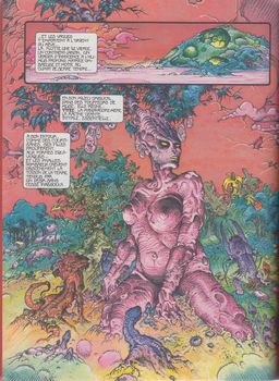 remarques: | album de SF en plusieurs épisodes 1) nuages (la pluie empoisonnée du monde des Oms) 2) le jour de flûte (allusion à celui de Harlem) 3) mandragore (la plante issue de la semence rejetée par les pendus) >> p. 24 la mandragore-mère 4) la baîte (la femme qui couve l'oeuf de la baîte) 5) 'emorragie (la décontamination émotionnelle) 6) les ailes des autres (la cité "aut'om") 7) 'Om (la symbiose d'un 'om noir mâle avec une femelle blanche) >> des récits fantastiques avec fantasmes pas toujours bien compréhensifs, mais un bon graphisme Information dans une autre zone du temps et de l'espace, sur cette frange incertaine où les rouages du futur se mêlent aux fossiles du passé, là, aux frontières de la nuit, survivent encore les 'Oms = les habitants du crèpuscule |