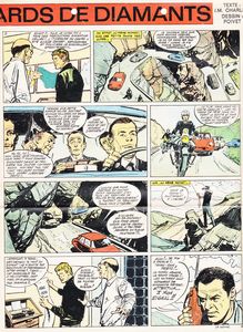 remarques: | pages détachées de Pilote, N&B >>> voir dossier 464D 5ème et dernier épisode des aventures de Guy Lebleu parues dans Pilote du no 352 (21.7.1966) au no 389 (6.4.1967) = 74 planches couleur non éditées en album n.b. album Fordis 2018, non collectionné Guy Lebleu travaille maintenant à l'ORTF "les grands reporters" et est envoyé à la nuit des diamants à Cannes où une exposition présentera pour 15 milliards de diamants, mais les diamants sont volés durant leur transport lors d'une attaque spectaculaire (voir pl. 3) une mystérieuse miss Sharp et ses complices auraient amené les diamants par ambulance à Orly sur le vol Paris-Tokyo et Sharp déguisée en hôtesse serait partie avec les diamants cachés dans son beauty-case, toutefois durant le vol, le Boeing 707 explose sur les alpes suisses et Lebleu envoyé pour enquêter ne trouve aucune trace des diamants sur les lieux de la catastrophe, s'en suit une enquête serrée résultant à l'arrestation du chauffeur de miss Sharp qui aurait vu celle-ci déposer un coffre dans une consigne à Orly et à faire semblant d'embarquer sur le Boeing, mais en fait aurait débarqué juste avant le départ, le complice voulant faire chanter miss Sharp, trouvera la mort, toutefois Guy Lebleu après une poursuite difficile réussira à s'emparer de miss Sharp >> pl. 11 miss Sharp, une vieille habituée du vol Paris-Tokyo >> un vrai récit polar à la Charlier, le début est spectaculaire et captivant et la suite n'est qu'une immense machination criminelle que Lebleu va résoudre à sa façon, toujours un bon graphisme de Poïvet, dommage à nouveau pour la couleur mal réussie dans l'album mais qui était très bien exécutée dans le journal Pilote (voir annexe) n.b. épisode paru aussi dans Nouveau Tintin 1977, parution en édition pirate 2009, mais de mauvaise couleur, parution par l'éditeur Fordis en 2018 avec une meilleure couleur mais qui ne peut égaler ceele parue dans Pilote |