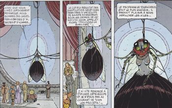 remarques: | le duc Malik a pris le pouvoir sur Mortelune alors que le prince et ses amis ont trouvé refuge dans les catacombes aquatiques de Mortelune >> p. 15 rencontre avec le contrôleur des lilas finalement, l'équipe de Nicolas sortent des catacombes par une sortie de secours (Orly sud), mais sont capturés par Malik qui tue petite souris pour faire parler Barnabé, l'inventeur de l'elixir de jouvence, par la même occasion, mort de Pancrasse, Barnabé meurt aussi, mais le prince et ses amis sont sauvés par un bateau volant manipulé par de mystérieux personnages cagoulés, ce sont des mouches géantes qui les amènent à la reine des hybrides qui veut produire une nouvelle race avec des humains, il n'en ont pas l'occasion, car Malik intervient et nos amis doivent s'enfuir en catastrophe avec un véhicule mis à leur disposition par la reine la poursuite continue avec une quête à la mer organisée par Nicolas >> p. 22/23 la vision de la mer par Nicolas >> p. 36 la reine des hybrides >> la série continue en s'essouflant quelque peu avec des apparitions cauchemardesques, mais un graphisme et scénario qui restent surprenant et bien imaginés |