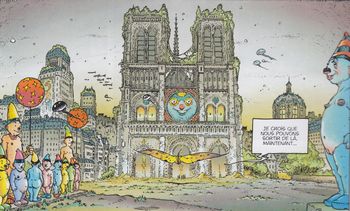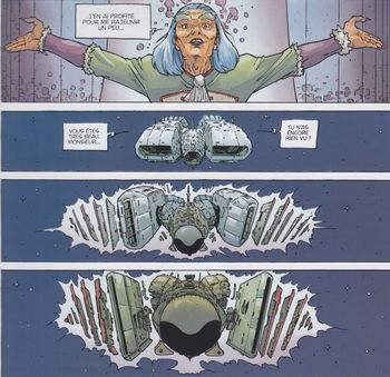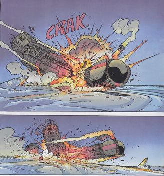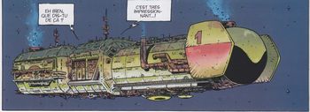 remarques: | les occupants du vaisseau spatial: - Suzie Ho botaniste-zoologue, - Tom Mac-Nell astro-physicien, - Max Lepsky biogénéticien, - Paule Latout psychosociologue, - Albert BD le robot de service, - Puce l'extra-terrestre et - mascotte, IC-One l'ordinateur central (ce sont peut'être les nouveaux pionniers de l'espace) la Terre n'est plus qu'une poubelle et le vaisseau spatial s'échoue dans les fonds de l'océan où il menace de se désagréger, mais les personnages (esprits) de Mortelune dont surtout Barnabé arrivent à la rescousse et Nicolas imaginera même une cité aquatique où les cosmonautes pourront se réfugier >> p. 23 on y revoit aussi la loco-machine du duc Malik qui s'écrase et se désagrège au sol la série se désagrège aussi, Nicolas en tant que Dieu, Malik en tant que Diable, c'est la lutte entre le Bien et le Mal, la guerre des dieux, mais ni le graphisme ni le scenario ne sont plus très convaincants la série continue avec trois autres volumes (non collectionnés ici ) - la mort de Nicolas (1997) - de profundis (1998) - la recherche du temps perdu (2000) |