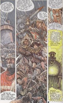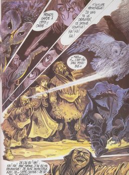 remarques: | Serramale est investie par les hommes de Supery, le fou de dieu, lutte avec les surhumains de Xanthia, entretemps Jubal le nabot prend possession (par hasard?) de l'arc d'azur, l'arme absolue des extra-terrestres de Xanthia, Foc et le chevalier Maleaume après avoir débarrassé Serramale des sbires de Supery, prennent en chasse Jubal pour récupérer l'arc d'azur >>> toujours un bon graphisme, mais on se perd dans l'imbroglio du scénariste de Durand tandis que le graphisme de Bordes est respectable |