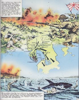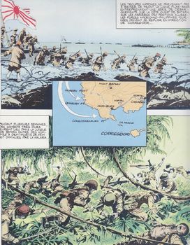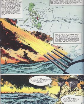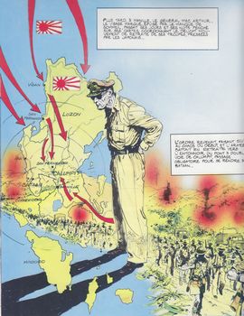 remarques: | un des meilleurs albums de la série, bon scenario de Gourmelen et graphisme dynamique de Dupuis vie et exploit de l'amiral Mac Arthur, gouverneur en 1941 des Philippines qu'il dût quitter après l'attaque foudroyante des japonais, l'aviation à l'aéroport de Clark Field et la marine à Cavite furent prises par surprise et complètement décimées, >> p. 4 le chant de guerre japonais "Umi Yukaba" après une courageuse résistance à Bataan et Corregidor, ses troupes étaient aussi atteints de l'ankylostomiase (l'ankylostomiase est une infection parasitaire due à des vers de la classe des nématodes) >> p. 34-37 le départ de Mac Arthur vers l'Australie par PT boats (patrol and torpedo boats) avec sa femme, son fils Arthur et la nurse chinoise après son départ, Mac Arthur fut nommé commandant des forces terrestres pour l'Asie du Sud-Ouest (de l'Australie à l'Indochine) tandis que Nimitz était commandant des forces navales du Pacifique nord et sud n.b. à titre de comparaison, chaque commandant de secteur était comme un général installé à Londres et repoussant des offensives à Moscou >> p. 45/46 les tragédies sur la piste de Kokoda en Nouvelle-Guinée, reliant à travers une terrible jungle les ports de Port Moresby à Buna, Guadalcanal et Buna furent les deux premiers succès des alliés dans le Pacifique, puis ce fut la conquête de Rabaul en Nouvelle-Bretagne (archipel Bismarck), la conquête de la Nouvelle-Guinée terminée, les forces de Mac Arthur partiront à la reconquête des îles Molluques et Philippines >> p. 53 l'extraordinaire tenacité et courage des soldats japonais étaient broyés par la machine de guerre américaine tournant à plein rendement le 20.10.1944 Mac Arthur débarquait aux Philippines où finalement la flotte nippone est pratiquement écrasée à la bataille de Leyte (la bataille du tir aux pigeons) par la suite, Mac Arthur dirigera les opérations durant la guerre de Corée en 1950, l'homme à la pipe meurt en 1964 à l'âge de 84 ans >> un super album avec un texte particulièrement intéressant et toujours un bon graphisme de Dupuis |