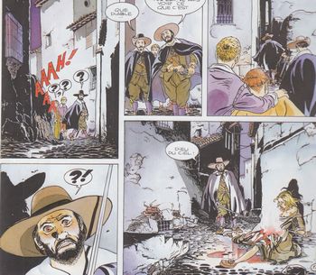 remarques: | l'aventure commence dans les tripots de Madrid où Martin (un ami d'Elvira) veut faire fortune en jouant gros, puis c'est une chasse au voleur de tuiles, enfin une nouvelle affaire criminelle avec "l'inquisiteur" qui tue des prostituées et leur enflamme leur ventre (genre Jack l'éventreur) >> cette fois, un album vraiment nul, graphisme en nette baisse de qualité et le scénario d'une infinie banalité, la série s'arrête ici malgré un prochain album annoncé "le feu satanique" qui ne paraîtra jamais n.b. curieusement cet album vraiment médiocre est difficile à trouver (tirage limité?) et obtient une certaine valeur marchande |