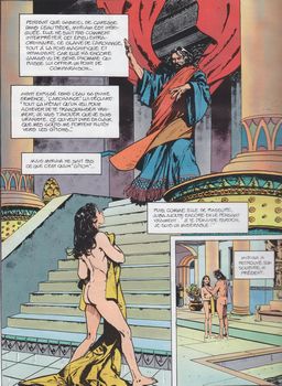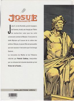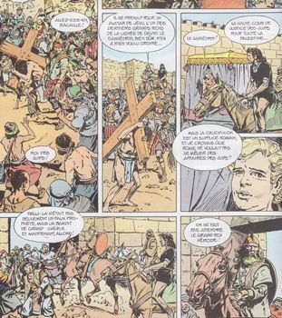 remarques: | au temps d'Auguste, les tribulations de Juba II, roi de Numidie en Palestine avec son conseiller grec Cléophas, il doit se renseigner pour Tibère sur la venue d'un mystérieux messie, rencontre de Juba avec le roi Hérode >> p. 36 description des membres du clergé juif: a) les Sadducéens descendants de Sadoq, chefs de clergé de Salomon (= les aristocrates) b) les pharisiens dérivés de parsi = habitants de Parthyène = les vrais juifs malgré leur origine étrangère et docteurs de la loi Juba fera la connaissance de Myriam, une jeune fille juive auprès de laquelle il se fera passer pour l'archange Gabriel >> le Nouveau Testament version Fuente, récit biblique et historique d'un nouveau genre avec un bon graphisme et un scenario de Cothias quelque peu déconcertant et philosophique, mais respectable |