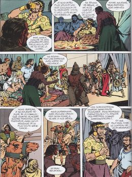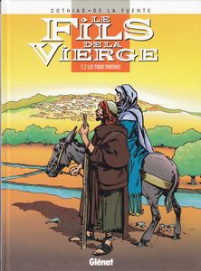 remarques: | avec ce deuxième album, le nom de la série change de "Josué de Nazareth" (qui n'avait pas beaucoup de relation avec la série) au "le fils de la vierge" Joseph, le rabbin de Jérusalem, reçoit en tutelle sa nièce, la jeune Myriam, orpheline, peu de temps après Myriam devient enceinte, hors des liens du mariage chez les juifs, la femme qui a commis le péché de chair doit être lapidée, mais les membres du Sanhédrin constate que chez Myriam, son hymen est resté intacte, elle est donc épargnée, mais vu la rumeur public, Joseph quitte Jérusalem et se rend à Nazareth à ce moment, Juba est de retour en Palestine, rempli de remords, il veut retrouver Myriam, nouvelle visite chez Hérode où Juba assiste à l'arrivée des 3 parthes (rois mages) qui se rendent à la naissance annoncée par les astres d'un messie à Bethléem, mais à leur surprise l'enfant mis au monde par Marie, épouse de Joseph le charpentier de Nazareth, est une fille et le vrai Jésus est celui mis au monde à Nazareth par Myriam, épouse de Joseph question: qui est Joseph de Nazareth ou de Bethléem? >> Fuente s'amuse beaucoup avec cette nouvelle version du Nouveau Testament mais il y a aussi beaucoup de Jesus dans ce récit (tome 1 et tome 2: mention de 2 Jesus crucifiés), toujours un bon graphisme, mais un scenario désordonné quoique restant intéressant et finalement selon Fuente/Cothias le roi Hérode n'aurait pas été un trop mauvais roi n.b. il n'y aura pas d'autres albums et le mystère Jésus selon Fuente/Cothias restera sans suite |