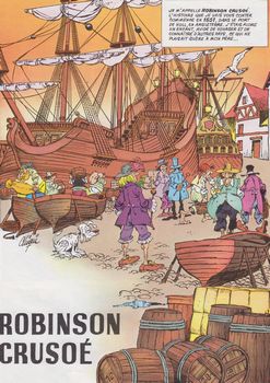 remarques: | 30.9.1651 Robinson Crusoe de son vrai nom Alexandre Selkirk, un marin écossais est débarqué sur une île déserte (probablement dans l'archipel Juan Fernandez/Chili) et y restera env. 5 ans avant d'être retrouvé par un navire britannique qui le reconduira en Angleterre son unique obsession fut de survivre (grâce à du matériel échoué sur le rivage de son île), de quitter l'île et de retourner à la civilisation >> petite histoire semi-comique de Robinson Crusoe assez bien dessinée mais avec un texte sans grande prétention prologue histoires de naufrages notamment celles dans l'antiquité d'Ulysse dans son "Odyssée" et de Simbad le marin, en 1719, Daniel Defoe écrira son roman "Robinson Crusoe" suivi en 1726 par Jonathan Swift "voyages de Gulliver", plus tard Jules Verne écrira un roman du même genre "l'île mystérieuse" |