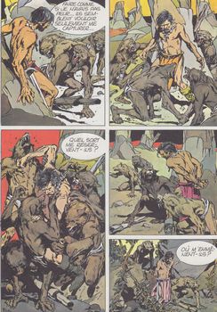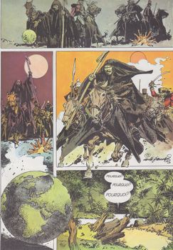 remarques: | la suite des péripéties d'Haxtur dans un monde préhistorique, à la fin de son parcours, Haxtur trouvera son double, mais il n'aura pas trouvé la réponse à ses questions (vanité de l'homme?) >>> toujours un bon graphisme de Fuente dans un récit loufoque et abracadabrant mais plutôt amusante avec comme toile de fond l'existence futile de l'homme menacé par les quatre cavaliers de l'apocalypse |