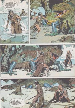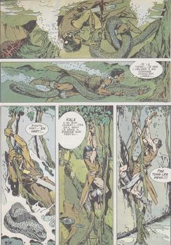remarques: | la suite de la quête de Mathai-Dor qui non seulement retrouvera le feu, mais aussi le pouvoir de créer le feu >> p. 46 un tube de bambou dans lequel un mouvement de friction est effectué par un bout de bois muni d'amadou = intéressante procédure, peut'être plus efficace qu'en frottant deux silex le courage de Mathai-Dor aura été récompensé >> toujours un bon graphisme original, mais également un texte très faible |