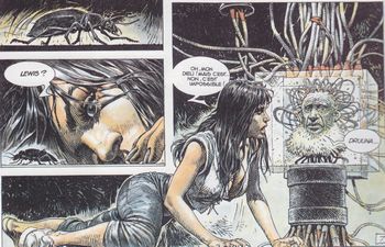 remarques: | la suite de la quête de Druuna après une séance d'amour psychique par projection spatio-temporelle avec Lewis qui lui explique qu'il faut détruire l'ordinateur Delta dans la tour du pouvoir afin de libérer la planète (en fait un immense vaisseau spatiale organique) après de nombreuses péripéties (notamment avec la jeune Hale qui sera sacrifiée et avec le travesti-tortionnaire Seka, un nouveau un genre d'hermaphrodite qui torture Druuna), Druuna est délivrée par son ami-protecteur le gnome et arrive dans la salle où est situé Delta >> p. 45 la salle de torture 77 >> p. 59 l'ordinateur Delta malgré les injonctions de Lewis, Druuna ne peut se résoudre à détruire Delta ce qui provoquerait l'anéantissement du vaisseau, elle quitte Lewis (qui voulait détruire Delta pour pouvoir enfin mourir) et part à la recherche de Shastar en compagnie de son gnome inséparable >>> toujours un bon graphisme et un bon scenario, mais le texte laisse un peu à désirer avec à nouveau de nombreuses interjections telles que "mon dieu", "seigneur" etc, ce qui n'améliore pas le récit n.b. pour la première fois, Druuna est mentionnée dans le titre |