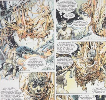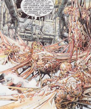 remarques: | sur le vaisseau spatial de Will, Doc décide de procéder à une analyse complète de Druuna >> p. 8-17 les rêves érotiques de Druuna notamment sur son accouchement Druuna communique avec Shastar et Lewis qui ont réussi à s'intégrer dans l'ordinateur de bord, de plus il semble que l'esprit du mal, en plus éventuellement d'avoir fécondé Druuna, ait aussi réussi à s'introduire dans le vaisseau des "réplicants" ou "prolet" qui ont pris la forme de certains membres de l'équipage dont l'androïde Terry et même la forme de Druuna, lutte entre humains et "réplicants", Druuna est gravement blessée et laissée pour morte, Doc cherche alors un moyen d'inverser le temps en remontant dans le passé pour changer la route à suivre et échapper au danger du monstre alien >> p. 12 l'accouchement au bistouri de Druuna >> p. 17 l'accouplement de Druuna avec le mutant >> p. 36 la séance de sodomisation sur Druuna >> p. 51 la théorie du temps inversé >>> toujours un bon graphisme très érotique, mais quand même pas encore porno, avec de jolies couleurs, toutefois le scénario devient vraiment difficile à la compréhension et surtout un texte peu élaboré avec des interjonctions non nécessaires |