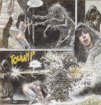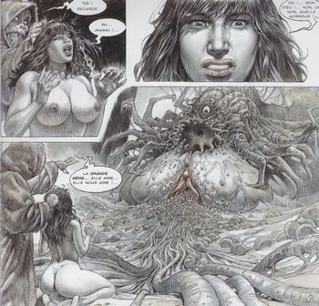 remarques: | un deuxièmre cycle sur Druuna avec comme titre: la planète oubliée no 1 Druuna, toujours en prise avec ses rêves et souvenirs, arrive maintenant dans une nouvelle cité où elle rencontre les "aventistes" = des prêtres mystérieux qui adorent la "grand-mère", le moyen de transport des aventistes: une limace géante >> p. 25 pour changer, Druuna se fait plaisir à elle-même les aventistes veulent unir Druuna avec la grand-mère, intéressée par le corps merveilleux de Druuna, elle sera à nouveau sauvée par son petit ami le gnome, accompagné cette fois d'un robot-araignée, puis rencontre avec un homme-machine qui se révèle être Shastar ressuscité et qui veut créer avec Druuna une nouvelle race au-delà des montagnes, ce qui devrait être le titre du prochain album: la planète oubliée no.2 >> p. 59 la foire aux horreurs >>> le graphisme est moins élaboré surtout pour les couleurs, scenario toujours compliqué et plutôt restreint, quelque peu une répétition des épisodes précédents, le manque d'imagination se fait sentir et on tourne en rond, ce n'est plus la planète oubliée, mais la planète à oublier |