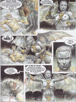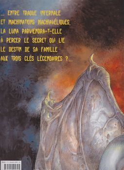 remarques: | à Venise durant une époque semblable à la Renaissance, le prince Asanti, un vieil homme, frère du doge est mourant et confie à Saria, sa fille, trois clés, l'une mène aux enfers, l'autre au paradis (la puissance) et la troisième au néant, mais on ne sait pas quelle clé mène à quelle dimension, toutefois il existe une porte qui accepte les 3 clés: la porte de l'ange >> p. 7 la visite à Asanti de Galadriel, l'ange de la peste, l'archange de Satan qui veut récupérer les clés, car il prétend en être le gardien >> p. 12 la galerie des portraits de la famille Asanti dont le cardinal Monzo mais d'autres personnages veulent s'emparer des clés dont le doge et Amilcar, son âme damnée, le duc des fasci (allusion à Mussolini), toutefois ils arriveront tous trop tard, Saria et son serviteur Orlando ont disparu par la même occasion, le vaisseau de la Dyle des Forçats se prépare à entrer à Venise avec son passager de marque: le martyr Ali Muslim Orfa 6 ans plus tard, Saria qui s'appelle maintenant la Luna est devenue une genre de justicière à la Zorro, elle sauve 2 adolescents destinés au supplice de la sphère >> p. 24 le supplice de la sphère ceux qui recherchent toujours les clés commencent à soupçonner la Luna d'être Saria et l'amant de la Luna torturé révèle la vraie identité de la Luna >> p. 34 le fourneau d'Herodias >> p. 46 la torture par scarabée sur le pêcheur Ricardo la Luna est capturée puis délivrée par un mystérieux scaramouche alors que débarquent à Venise Muredi d'Ispahan avec Ali Muslim Orfa pour légaliser la réélection du doge qui devrait s'effectuer sans problème grâce à son anneau de Moloch >> le graphisme est superbe et typiquement de Serpieri, le trait est bien exécuté avec également de fortes couleurs, le personnage de Galadriel est particulièrement intéressant, comme représenté sur la couverture de l'album, quant au scenario, c'est du pure fantastique basé sur de la fiction historique, avec Luna, Dufaux cherche à créer un genre de nouvelle Druuna historique, mais beaucoup moins érotique et malgré les clés du récit, on a bien de la peine à ouvrir les portes de la compréhension >> une expérience commencée par le duo Serpieri-Dufaux, mais qui aura une suite 5 ans après en 2012 avec une série rebaptisée Saria, ce premier tome "les enfers" sera réédité en 2012 sous la collection Saria avec un titre qui ne change pas "les trois clés" et le tome 2 changera de dessinateur avec Federici n.b. le premier tome "les enfers" montre une couverture bien réussie, en tout cas meilleure que la réédition avec comme titre Saria quant à l'édition du tome deux intitulé la porte de l'ange, le graphisme n'égale pas celui de Serpieri il y aura un troisième tome en 2020 titré "la fin d'un règne" mais non collectionné ici annexes: - couverture de l'album original "les enfers", 1er plat et 4ème plat - tome Saria 1 les trois clefs (2012), réédition de "les enfers", dessinateur Serpieri - une planche avec l'archange de Satan (l'archdiable) |