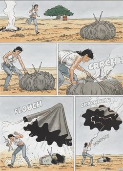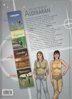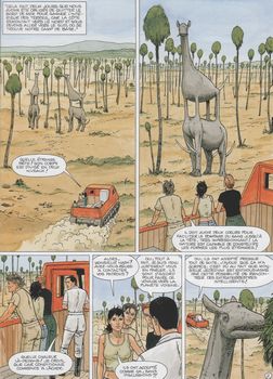 remarques: | les naufragés se dirigent toujours vers la base centrale >> p. 4 les animaux à deux niveaux entretemps, on apprend que Jedediah, gourou de la secte, frère d'Elijah, propriétaire de Forward Entreprises veut prendre la direction de l'expédition dirigée vers Antarès 4 et il ne veut pas de Kim dans son équipe >> p. 12 toutefois Elijah se lave les mains des actes de son frère Jédediah dans une caverne où les naufragés ont trouvé refuge, ceux-ci découvrent des peintures rupestres paléolithiques, mais aussi >> p. 18 une piscine naturelle très agréable >> p. 19/20 lutte contre les limaces suceuses de sang qui tuent deux membres de l'équipe de Kim (sic!) et la philosophie de Kim sur les prières aux morts, mais sans envie de pleurer cette fois et maintenant c'est la jeune fille Lorna qui est amoureuse de Kim! à la base centrale, Alexa réussit à s'emparer d'un hélicoptère pour récupérer les naufragés >> p.32/33 nouveau combat cette fois contre des monstres-parapluies paralysants (cette planète est un véritable paradis de monstres!) après quelques jours et grâce à Alexa, les naufragés rejoignent la base centrale où règne un ordre nouveau, ils sont aussitôt emprisonnés mais une révolte contre les dirigeants de la base libère nos amis peu après cette fois, tout est prêt pour l'expédition vers Antarès 4, composée de Kim, Alexa, le sous-commandant Scott, Zao, le dr Amos mais aussi du sectaire Jedediah qui comme initiateur du projet Antarès a exigé de faire partie de l'expédition ce qui ne va pas arranger les choses avec les autres membres de l'expédition >> p. 48 et une nouvelle crise pleureuse pour la wonderwoman Kim! N.B. à noter p. 30 l'utilisation de "kamikazes" dans les explorations spatiales >> ce 4ème épisode est un peu décevant si le texte et le graphisme de Leo restent plus ou moins dans la lignée des trois albums précédents, idem pour les nombreuses discussions sur les rapports humains et parfois philosophiques (tel les limites à respecter pour la colonisation de l'espace), le scénario ne montre plus grand intérêt et laisse traîner le récit dans l'attente de l'expédition vers Antarès-4 bien sûr, les ressources d'imagination ne sont pas inépuisables mais on a quand même l'impression que la série devient petit à petit une affaire de sous en la faisant durer dans le temps interspatial! |