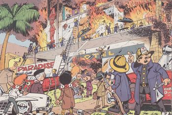 remarques: | collection Vedette no 44 Hawai, plage d'Halahaki où les propriétaires (Tony Aloha et Johny Cargo) de deux super hôtels le "Flamingo" et le "Paradisio" se font une concurrence acharnée, le tout manipulé par Joe Puma et son acolyte Max Minus, Rock Derby invité par Tony Aloha se fera un plaisir de dénouer les noeuds de l'intrigue n.b. petite erreur sur la personne en page 28 case 8! >> un assez bon album, un bon scenario, un graphisme respectable et à la fin de l'album, l'adieu aux lecteurs: "au revoir les amis, c'est fini" |
