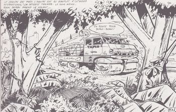 remarques: | Rock Derby est engagé comme chauffeur d'un véhicule tout-terrain, surnommé le "tapir" par la société "bois précieux" au Brésil, Rock Derby doit effectuer un percement dans la forêt amazonienne pour une autoroute qui servira à transporter les bois, il prend comme assistants Pedro Arara et Baba >> p. 13 Rock Derby devient momentanément Tarzan nos amis se perdront dans la jungle amazonienne, démêlés avec les coupeurs de têtes et finalement arrivée à la base de la société Boro Boro >> p. 26 le combat avec la mygale géante >> rare album magic Strip, mais somme tout un album plutôt faible et pas à l'avantage de la forêt amazonienne Information dans ce genre aux éditions Magic Strip, il y aura encore deux autres album: - défi de l'invisible (1980) - une étoile a disparu (1980) (mais non collectionnés ici) |