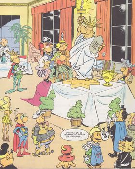 remarques: | à nouveau de bons gags tels que: le gag psychologique, la faim, nostalgie, les jeux télévisés, l'obésité, le bal costumé >> p. 13 le masque à la Goscinny >>> un album très bien conçu |