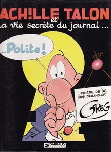 remarques: | pages de vie sur Polite, le journal d'Achille Talon avec son célèbre rédacteur en chef, la rentabilité, le support juridique, la promotion, les déjeûners d'affaires, les contrats dont le contrat Cassin, la bande non-dessinée, le petit prodigue protégé, etc mention est aussi faite de la foire BD de Chamboulême et des concurrents dont Titin, le journal des jeunes >> p. 44-47 les réunions d'entreprise >> un bon album qui reflète fidèlement les extravagances inutiles de la vie commerciale et du journal Polite, la fin de l'album est particulièrement bien réussie |