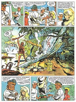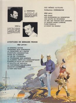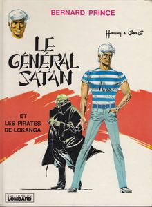 remarques: | les premiers albums de Bernard Prince ont été publiés par les éditions Dargaud Jeune Europe, format broché, le présent album est une (3ème?) réédition cartonné aux éditions Lombard (1975), 13 titres au 4ème plat premières aventures de Bernard Prince, album divisé en 2 épisodes: a) les pirates de Lokanga = recherche de caisses de diamants bruts échouées dans la jungle africaine, Prince sur son bateau "le cormoran" (qui est peut'être la vraie vedette dans les aventures de la série) est accompagné de Djinn, le petit hindou et de Barney Jordan, le marin braillard, ils seront attaqués par les féroces guerriers Wadongos, apparition aussi de leur ennemi juré: Bronzen 2) général Satan, début de la lutte contre le plus grand ennemi de Prince: le général Satan accompagné de son amie Lotus Pourpre qui prendra finalement la cause de Bernard Prince >> un premier album encore assez moyen tant pour le graphisme que pour le scénario, ressemblance avec la série Bob Morane dans le 2ème épisode annexes - couverture et 4ème plat du tome 1 - l'évolution de Bernard Prince dans la série Information Bernard Prince est le héros éponyme d’une série de bande dessinée d'aventure créée par Greg (scénario) et Hermann (dessin) en 1966 dans le Journal de Tintin, Dany a repris le dessin pour les tomes 14 et 15 puis a laissé sa place à Aidans pour les tomes 16 et 17, à partir du tome 18, paru en 2010, Hermann reprend le dessin plus de trente ans après son dernier album de Bernard Prince, sur un scénario de Yves Huppen, fils de Hermann Huppen Bernard Prince est un ancien policier, membre d'Interpol, qui parcourt le monde à bord de son navire, le Cormoran, qui tient à la fois du yacht et du cargo, il est accompagné dans ses aventures par un marin bourru, bagarreur et alcoolique, Barney Jordan et Djinn, un jeune enfant indien qui est devenu son pupille n.b. il existe d'ailleurs au sujet des origines de Djinn une incohérence: présenté par Greg en 1966 comme un orphelin de Karachi, donc pakistanais, il est par la suite présenté comme "un enfant perdu de Calcutta", donc indien Hermann et Greg ont d'abord publié sept récits complets, de 4 à 6 pages chacun, dans le Journal de Tintin en 1966, ces récits mettaient en scène le héros comme inspecteur d’Interpol, jusqu’à ce qu’il hérite d'un bateau: le Cormoran ce changement de cap de la série, du genre policier à celui de l'aventure, aurait été dicté par des raisons éditoriales, le Journal de Tintin ayant déjà un détective avec le personnage de Ric Hochet, devenue une série d'aventures, ce sont les catastrophes naturelles et les endroits de la planète (très) inhospitaliers pour l'homme qui vont devenir la marque de fabrique de Bernard Prince, caractéristique unique dans le paysage de la BD européenne, à la demande expresse d'Hermann la série est clairement inspirée par celle de l'Épervier Bleu, créée par Sirius en 1942, puisque Eric, dit l'Épervier bleu, y est flanqué d'un acolyte roux dénommé Larsen et de Sheba, un enfant indien portant turban |