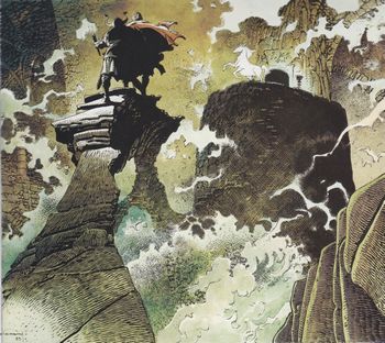 remarques: | la quête du chevalier Aymar se poursuit, il fait connaissance avec le chevalier anglais William, apparition du cheval blanc qui disparaît mystérieusement dans des pertuis (= ouverture ou trou), c'est le cheval d'Hervör qui détient un trésor, Sigurd, fils d'Hervör, recherche le cheval pour arrêter la malédiction qui pèse sur sa famille à cause d'un crime perpétué par un ancêtre finalement on retrouvera la tombe d'Hervör, le trésor et la mort, mais le lecteur ne s'y retrouve pas trop et à la fin de ces aventures macabres et mythologiques, le chevalier Aymar qui a vécu ces évènements dans un semi-cauchemar déclarera vouloir se rendre en Terre Sainte >> p. 31 le cheval d'Hervör >> p. 33 l'entrée du mausolée >> intermède fantastique et mystique, un scénario quelque peu difficile à suivre mais le graphisme est toujours bien exécuté |