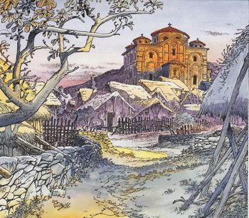 remarques: | en route pour la croisade, William, fils d'un seigneur anglais, accompagne Aymar et Olivier >> p. 5 un acte de charité comme expliqué par Aymar >> p. 6 un discours d'ivrognes péripéties lors de la traversée de la Hongrie, le groupe de pélerins à qui Bois-Maury donne protection tombe dans un traquenard arrangé par des indigènes qui haïssent les étrangers à cause des rapines causées par les croisés précédents, nos amis réussiront toutefois à s'échapper grâce à une ruse cruelle >> scénario pas trop recherché, mais toujours de magnifiques couleurs et une jolie couverture d'album avec en arrière-plan la tapisserie de Bayeux n.b. discussion sur dieu dans cet album >> p. 46 dieu est avec nous mais pour qui est dieu (ou diable)? >> p. 37/45 dieu qui contrôle tout >> p. 45 le signe de dieu |