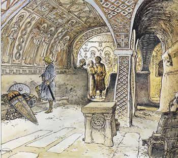 remarques: | avec Olivier, William, le chevalier Hendriks et leur guide grec Miltiadès, Aymar continue son chemin vers Jerusalem, combats entre byzantins, seldjoukis (arabes), franj et danishmen (croisés), capture par Aymar du fuyard seldjouki Sandjar qui se révèle être un personnage important et qui indirectement sauvera l'équipe de Aymar, mais le guide devra y laisser sa vie >> p. 22 les moines-troglodytes >> p. 42 la grande bataillerie >> un épisode intéressant, un peu incohérent vers la fin, mais avec un bon texte et moult humour et toujours un superbe graphisme |