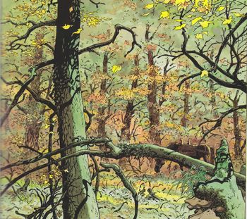 remarques: | préface et résumé sur Aymar de Bois-Maury, confrontation entre Guenièvre, l'épouse et Olivier, l'écuyer à qui Hermann dédit le titre de ce dernier album sur l'épopée du chevalier Aymar de Bois-Maury qui meurt dans ce récit de 62 pages Aymar est arrivé sur ses terres pour constater que le seigneur usurpateur Guibert en a pris possession, s'en suit un duel à mort entre Guibert et Aymar qui en sort vainqueur, mais son épouse est enlevée par le frère de Guibert qui la garde en otage, elle sera finalement délivrée par Olivier réconcilié avec elle, toutefois Aymar de Bois-Maury meurt durant le combat, sa descendance sera toutefois assurée, car Guenièvre attend un enfant de lui dans cet épisode, Germain le voleur sera retrouvé et pendu alors que le chevalier William meurt aussi dans les combats >> p. 21 une belle partie de chasse >> p. 39 la mort de Germain >> p. 57 la mort de William et dernière page la mort et la naissance des Bois-Maury >> album agrémenté de 16 pages supplémentaires, fin de l'errance du chevalier Aymar de Bois-Maury qui retrouvera son castel (dont les tours ne sont pas aussi hautes et aussi belles que le prétendait Olivier son écuyer), mais qui meurt juste après l'avoir reconquis >> le scénario n'est pas à dédaigner et le graphisme est excellent avec des couleurs automnales pour ce récit tragique |