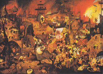 remarques: | en Flandres, Titetmann, le prévôt-inquisiteur, fait la chasse aux hérétiques luthériens alors que les gueux se soulèvent contre la domination espagnole >> p. 17 le jeune Toone qui assiste à l'exécution de ses parents le chevalier Bois-Maury, grièvement blessé, arrive dans un village de Flandres, soi-disant pourchassé par le démon, il est soigné par la jeune fille Tinne, Bois-Maury voit sa mort le prendre, mais avant de mourir, il réussit à faire un enfant à Tinne pour continuer sa descendance >> dernière page: Tinne enceinte de Bois-Maury et le peintre Breughel qui fera de ces évènements le sujet de son tableau: dulle griet >> un album décevant, le graphisme ne montre plus une aussi bonne qualité qu'antan et le scénario du fils d'Hermann ne veut pas dire grand chose malgré une nette référence à Thyl Eulenspiegel Information Dulle Griet ou Margot la folle, est une huile sur panneau de chêne de Pieter Brueghel l'Ancien, inspirée de Dulle Griet, personnage du folklore gantois (Margot la Folle), elle date probablement de 1562 la peinture montre une paysanne, Dulle Griet qui est à la tête d'une armée de femmes en route pour piller l'Enfer, autour d'elle, les scènes de destruction dominent le paysage, l'attaque a été probablement menée par elle, la couleur dominante du tableau est le rouge des flammes détail du tableau alors que ses compagnons d'armes féminines vandalisent une maison, Dulle Griet s'avance vers la bouche de l'Enfer au milieu d'un paysage peuplé de monstres tout droit sortis de l'univers de Jérôme Bosch, ces derniers représentant les péchés qui sont punis cette œuvre est une des peintures les plus complexes à interpréter, en effet, il est difficile d'identifier chaque personnage, chaque créature monstrueuse et chaque objet ayant un symbole magique et un lien avec l'alchimie, cette peinture présentant un paysage apocalyptique et incendiaire est aussi mystérieuse pour l'interprétation de la scène infernale qui a une signification indéniablement profonde avec une vision pessimiste |
