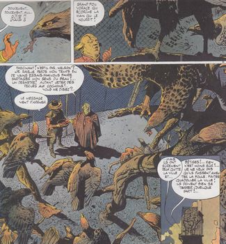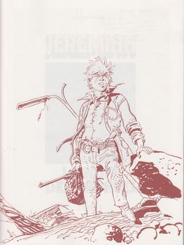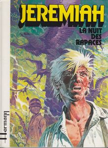 remarques: | début d'une série futuriste, au contraire des Tours de Bois-Maury, une série reprise par plusieurs maisons d'éditions: d'abord Fleurus, puis Edi-3, Hachette, Novedi et enfin Dupuis dans un monde post-atomique, le jeune Jeremiah et le truand Kurdy Malloy avec sa mule Esra (the lonely two cowboys) apprennent à se connaître, avec un groupe de révoltés, ils combattront le mystérieux Mr. Birmingham (alias Fat-Eye) qui élève des rapaces et l'esclavagiste John Mahani, le Custer de la nation rouge qui capture des réfugiés fourni par la bande de Birmingham >> p. 23 les rapaces de Fat Eye >> p. 45 la mort de celui-ci par ses trésors de rapaces >> un nouveau genre de BD développé par Hermann qui appelle ses albums des "one-shot" = courts récits qui peuvent être lu séparément, le scénario est un peu spécial, mais le graphisme est de bonne qualité avec souvent de superbes couvertures d'album Information A) la série Jeremiah bénéficie à l'origine de l'excellent dessin de Hermann et d'une colorisation très efficace pendant la période Fraymond. par contre, au niveau des scénarios, c'est très quelconque, on est dans l'escarmouche et la bagarre façon Rambo l'environnement post-apocayptique est sous-exploité, les codes sont ceux du western en ajoutant à cela des découpages assez confus à suivre B) l'action se déroule aux États-Unis dans un futur indéterminé, environ 20 ans après une guerre généralisée entre les Blancs, les Noirs et les Rouges, ce qui a détruit une grande partie de la civilisation, le héros, Jeremiah, est un fils de fermier, au départ naïf et inexpérimenté, il grandit et s'aguerrit au fil de la série en évoluant dans un univers post-atomique très chaotique (rappelant souvent le film Mad Max), tout en conservant certaines valeurs morales, il est accompagné de Kurdy Malloy, un mercenaire sans foi ni loi, peu fiable et à la morale douteuse, mais qui partage son refus viscéral de l'injustice, le tandem est lié par des rapports d'amour-haine très perturbateurs chaque album est une histoire indépendante mais, outre une réapparition de certains personnages tout au long de la série, on peut relier certains tomes entre eux, l'originalité de la série tient en ce que l'auteur tisse très souvent chaque tome à partir d'une histoire anecdotique et indépendante des personnages principaux pour aborder en toile de fond un thème de société important et raconter un épisode de la vie de Jeremiah et de Kurdy il est souvent arrivé que certaines des anecdotes n’interfèrent pas du tout avec l'histoire principale ou ne se résolvent pas, comme pour montrer que Jeremiah et Kurdy n'étaient que de passage et n'avaient que peu d'impact sur leur époque ou leur entourage, le titre de chaque tome est d'ailleurs souvent présenté après quelques pages séparant ainsi l'anecdote de l'histoire principale on peut retrouver plusieurs thèmes récurrents et contemporains du XXIème siècle tout au long de la série: la corruption du pouvoir ou de la justice, le despotisme éclairé et la dictature, l'esclavagisme et les sectes, la drogue, l'individualisme, la pédophilie, le racisme ou l'univers mafieux, les thèmes sont souvent abordés de façon violente, très cynique et en mi-teinte, s'éloignant de la mode du scénario manichéen souvent prisé dans les bandes dessinées: l'injustice perdure, le pouvoir corrompu est remplacé par un contre-pouvoir encore plus perverti et les "gentils" ne gagnent pas souvent, le cynisme brutal de Kurdy ou le réalisme triste de Jeremiah sont utilisés pour souligner le peu de foi que l'auteur semble avoir pour l'espèce humaine, ils mettent beaucoup d'énergie à gagner de vaines batailles dans des guerres perdues d'avance les personnages: - Jeremiah, on le découvre dans le premier album, survivant du massacre de tout son village de Bends Hatch, il est candide, fleur bleue, fier et idéaliste au début tant il ne connait rien à la vie, il évoluera au fil des épisodes, s'aguerrissant en gardant ses idéaux du départ, mais prenant beaucoup de libertés avec la moralité dans les derniers épisodes tant la vie l'a marqué au fer rouge, même s'il conserve toujours la volonté de défendre la veuve et l'orphelin ou l'opprimé, il devient parfois violent, soupe-au-lait, dragueur d'un soir, c ynique et lucide, courageux, cogneur sans pareil, bien moins bon tireur que Kurdy - Kurdy Malloy: peut-être est-ce lui qui a corrompu Jeremiah? on ne sait rien de lui si ce n'est quelques bribes éparses, vagues confidences au détour d'un chemin: un père alcoolique qui le battait et peut-être abusait-il de lui sexuellement, la vie a été dure avec lui et le seul moyen de s'en sortir a été d'être encore plus dur qu'elle, il est roublard, intéressé, cynique, froid, parfois insensible (sauf aux jolies filles et à l'argent), néanmoins, on lui découvre souvent des traits positifs comme la compassion (envers Jeremiah souvent), la pitié et l'engagement pour de nobles causes, courageux, tireur émérite, parfois cogneur comme Jeremiah, même si sa faible constitution le conduit à avoir le dessous lors des bagarres - Lena, fille de famille riche, insouciante et un peu snob, tenue à l'écart de ce monde apocalyptique où s'affrontent des gangs martyrisant le peuple ordinaire, qui se retrouve d'un coup, à la mort de son père, projetée dans cette réalité violente, elle en fera une dépression, Jeremiah a failli l'épouser, mais a finalement peur de s'engager pour des raisons peu claires, on la retrouve dans une maison de passe - Martha, tante de Jeremiah, elle a très mauvais caractère et incarne à elle seule une certaine Amérique: très puritaine, sectaire, hypocrite, prête à tout pour que le Bien triomphe et qui se tient tranquille tant que le Mal reste dehors ou s'essuie les pieds en rentrant, elle déteste cordialement Kurdy qu'elle livre parfois à ses ennemis, elle est rescapée du massacre de B