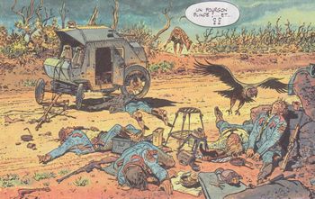 remarques: | Jeremiah et Kurdy mêlés à une chasse au trésor dans le désert, mais il y a de la concurrence: la milice Interville qui cherche à récupérer son bien et la bande à Sharita qui veut se l'approprier >> p. 27 un allié musicien quelque peu autiste (allusion au film Delivrance?) >> toujours un bon graphisme et un scénario particulier, violent et ironique |