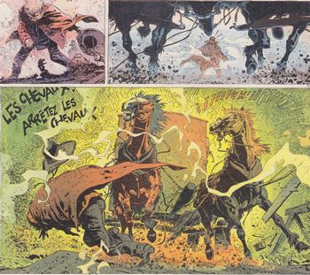 remarques: | Jeremiah et Kurdy confrontés à un quatuor (Jessika, Audie le fou, Briggs et Alvis) qui cherche à garder leur domination sur la population d'une bourgade en gardant secret la mort du grand sachem Nataniel qui était le maître absolu de la cité >> p. 3 chasse à la mouche pour p.4. pêche au revolver >> p. 29 l'histoire de la famille Bancroft >> p. 46/47 la mort d'Audie sur sa moto >> à nouveau un scenario et un graphisme violent, mais avec de jolies couleurs |