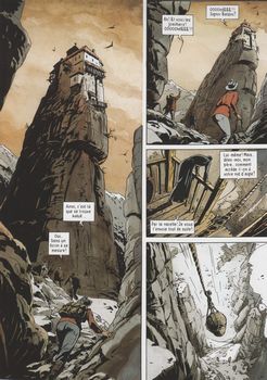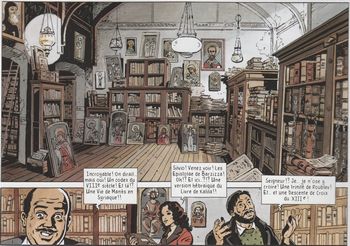remarques: | volume 3 le Meteore, l'amour des livres "tu n'attribueras aucune image à ton Dieu", signifiant que l'image de Dieu ne devrait pas figurer dans les peintures ce qui causera un fou-iconoclaste à vouloir détruire les images saintes entreposées dans le monastère grec Hagios Manolis perché sur un roc et il s'en prendra aussi à ses compagnons dont trois recherchent le fameux livre NAHIK qui est parvenu dans les mains des moines du monastère, finalement c'est la rescapée, une femme-écrivain américaine qui s'en emparera. dessinateur: Charles le Meteore = le monastère Grèce, Noël 1958, asile d'aliénés de Rhigos où St-Basile, le père Noël grec, vient rendre visite aux fous mais lors de son départ, aux vestiaires, le fou Panakis prend sa place et s'évade région des Meteores quelques jours plus tard, une groupe de 6 personnes dont une femme, dirigé par le signor Baldini, un bibliophile italien se dirigent vers un monastère grec, perché sur un roc, où ils pensent retrouver le fameux livre Nahik le groupe: Baldini, Adler un célèbre alpiniste autrichien, Darracq un industriel français, Mac Guire une écrivain américaine spécialiste du Coran, Farag Idriss un philosophe de l'université El Azahr du Caire et Sorescu, un spécialiste d'icône roumain + leur guide Yorgas >> p. 11 la thèse de Mac Guire "mythes, réalité et calculs politiques dans les versions coraniques antérieures à la vulgate d'Uthman" entretemps, la police grecque recherche le fou en fuite qui est soupçonné avoir pris la place d'un des randonneurs >> p. 15 Shelley Mac Guire qui aurait aussi étudié la dernière sourate; lors de la marche, mort de Darracq qui tombe dans une crevasse, Idriss se casse le tibia en voulant le secourir alors que la police est sur leurs traces pour récupérer Panakis >> p. 22 l'histoire du livre Nahik qui passe de Milena au pope de Mostar qui l'offre aux moines de Hagios Manolis comme l'a apprit Baldini lors d'une discussion avec Milena la visite du monastère >> p. 25 l'accès périlleux pour monter au monastère >> p. 30 les icônes mutilées >> p. 31 la bibliothèque du monastère le lendemain, Sorescu est retrouvé mort parmi les icônes, un jour plus tard c'est le tour de Baldini qui découvre le Nahik mais qui se fait tuer, le tueur est frère Dimitri alias Panakis, arrivé avant le groupe, qui a déjà assassiné les deux moines gardiens du monastère et qui pratique l'iconoclasme qui condamne le culte des images = idôlatrie et que Panakis pratique selon le troisième commandement "tu n'attribueras aucune image à ton Dieu", il veut aussi faire connaître son idée en propageant le contenu du livre Nahik >> p. 40/41 l'histoire de l'iconoclaste Panakis Panakis s'enfuit après avoir fait sauter le monastère avec de la dynamite mais il meurt dans l'explosion alors que Shelly miraculeusement rescapée est secourue par la police et réussit à récupérer le Nahik également miraculeusement rescapé au pied du roc du monastère >> à nouveau la malédiction du Nahik a frappé, toutefois ce volume n'a pas la résonance des autres albums, bien que le scénario soit assez bien élaboré, il n'est pas aussi captivant que les autres épisodes-commandements avec un graphisme honorable mais pas exceptionnel |
