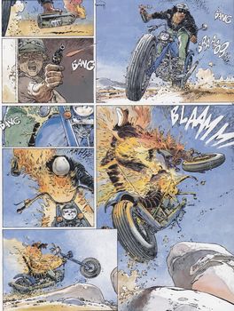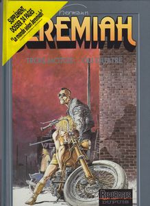 remarques: | album avec un supplément en première partie de 24 pages résumant les 16 albums précédents de Jeremiah et notamment petite dissertation sur les personnages principaux et révélation des désillusions et des indignations de l'auteur 2ème partie: histoire d'amour entre le cul de jatte Winston et la servante Daisy mêlés à un groupe de motards dont l'indienne (qui a le feu au cul) qui recherchent un ennemi intime, Stonebridge, pour lui soutirer le butin volé lors d'un raid, lors de la bagarre finale, Daisy deviendra une victime en y perdant les deux jambes et en épousant Winston qui lui promet des prothèses bien moulées >> p. 27 et 46 humour pour cul-de-jattes (jambes et bottes) >> un scénario pas trop mal combiné et toujours un bon graphisme |