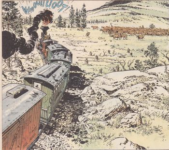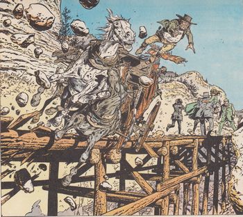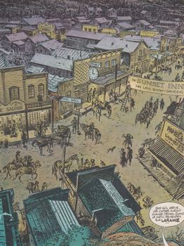 remarques: | la traque de Red Dust sur Russ Dobbs continue, entretemps Red fait la connaissance de nouveaux personnages: - Shaver Sharp, tireur professionnel de cirque - Bombardier Cavendish, le boxeur - Josuah Coogan, représentant en armes, qui reconnait le colt de Braggshaw après avoir voulu attaqué une diligence, Russ Dobbs et doc Wetchin (une ancienne connaissance qui s'est allié avec Russ) sont débusqués et tous deux seront abattus par Red Dust et ses deux nouveaux amis dans un saloon de Laramie (allusion au duel de OK Corral) mais Red Dust est arrêté par le shérif local pour meurtre! >> p. 2-4 le chemin de fer et la station ferroviaire de Triple Six >> p. 15 un pont pour diligence à tout épreuve >> p. 18 l'attentat sur la diligence >> p. 39 grand plan sur Laramie >> un super album surtout pour le graphisme et les couleurs avec une jolie couverture d'album, un passage moral pour Red Dust, il a promis d'exécuter, il a exécuté, mais il est décidé d'arrêter, malgré tout il est arrêté (il n'y a pas de justice) n.b. l'arrestation de Red Dust est quelque peu similaire à celle de Blueberry dans Angel Face à la même date 1975 |