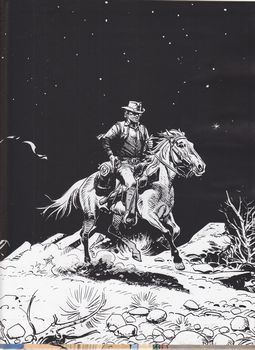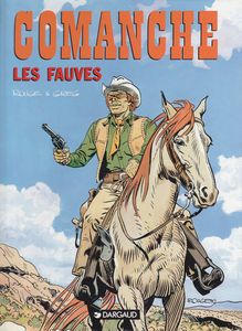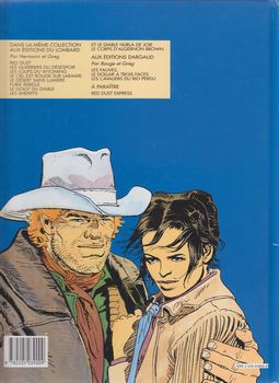 remarques: | 7 ans après, la suite des aventures de Comanche par le tandem Rouge+Greg, Hermann se consacrant à d'autres séries les passagers de la diligence pour Greenstone Falls sont massacrés sauvagement par un trio de fauves évadés d'un pénitencier: Murphy, Dopey alias Donahue et Santiago, les cheyennes assistent de loin au drame sans vouloir intervenir, mais avertissent le shérif Willard et Red Dust >> p. 13 premières explications sur les origines de Red Dust qui fit partie un temps d'une bande de détrousseurs, mais qui les quitta quand ceux-ci devinrent des meurtriers et Dust connait donc bien le trio des fauves Red, Larry Larson chasseur de primes et l'équipe du Triple Six se mettent sur la piste des fauves >> p. 25 Dust et Larry qui se font déculotter s'en suit une succession de combats durant lesquels Dust abat deux tueurs, le dernier étant descendu par les cheyennes qui sauvent la vie de Dust par la même occasion n.b. il manque maintenant un personnage principal parmi l'équipe du Triple 6: l'indien Tâche-de-Lune >>> un album sans grande prétention, une rencontre de chasseurs de primes, le graphisme de Rouge est assez bon, sans toutefois pouvoir égaler celui de Hermann et le scénario de Greg n'est cette fois pas très recherché n.b. nouveau 4ème plat et nouvelle page de garde |